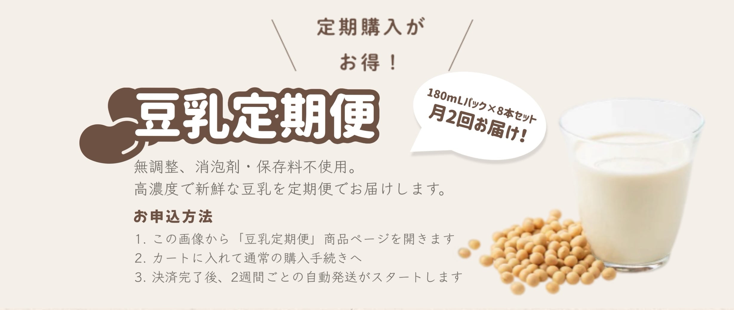 国産大豆100%使用の無添加豆乳(180ml)を、月2回(各8パック)合計16パックお届けする定期購入サービスです。 決済は2週間毎に2,500円ずつ自動決済され、1ヶ月あたり合計5,000円(送料込)となります。 【鮮度へのこだわり】 保存料・消泡剤などの添加物は一切不使用。 自社工場の専用設備で丁寧に製造しています。 常温保存が可能なロングライフ豆乳とは異なり、賞味期限は製造日より約2週間。 できたての品質を味わっていただきたいからこその短さです。 【月2回に分けてお届けする理由】 一度に大量に届くと、飲み切る前に賞味期限が近づく可能性があるため、 毎月8パックずつ・2回に分けて発送します。 ・常に新鮮なまま楽しめる ・冷蔵庫の保管スペースを圧迫しない ・生活スタイルに無理なく続けられる 「必要なときに、必要な分だけ」 鮮度を大切にしたいからこそ、この発送スタイルを採用しています。 【発送スケジュール】 発送日は平日のいずれかの日となります。 製造状況に応じて確定し、メールにてご連絡いたします。 通常の発送タイミング: ・8〜14日の平日:8パック発送 ・22〜末日の平日:8パック発送 【保管方法・賞味期限】 冷蔵保存(10℃以下) 賞味期限:製造日より14日 冷凍不可 開封後はその日のうちにお召し上がりください 【ご注意・必ずご確認ください】 ・2週間毎に2,500円の自動決済が発生します (1ヶ月目安:合計5,000円/送料込) ・発送回数:月2回固定 ※初回のみ一括発送となる場合があります ・発送日は平日限定(祝日・長期連休を除く) ・天候・物流状況などにより到着が前後する場合があります ・商品の特性上、キャンセル・返品はお受けできません ・長期不在による再配達は追加送料が発生する場合があります