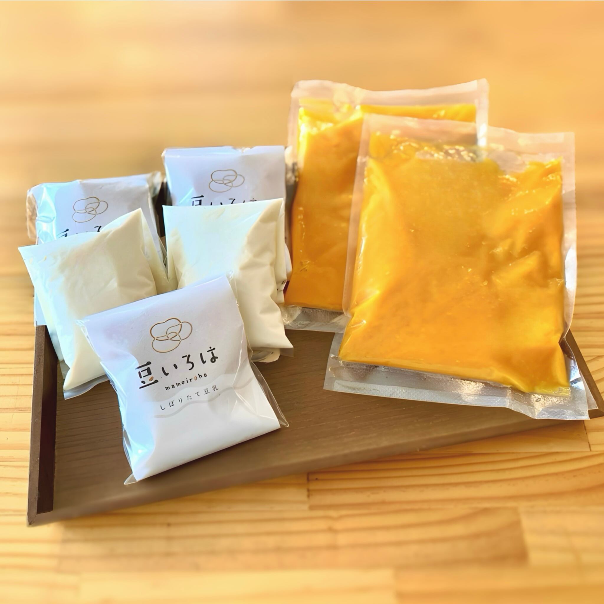 自家製豆乳「豆いろは」180mlパック×5本と、兵庫県産のやさしい甘みが特長のバターナッツかぼちゃペースト300g×2パックを詰め合わせました。